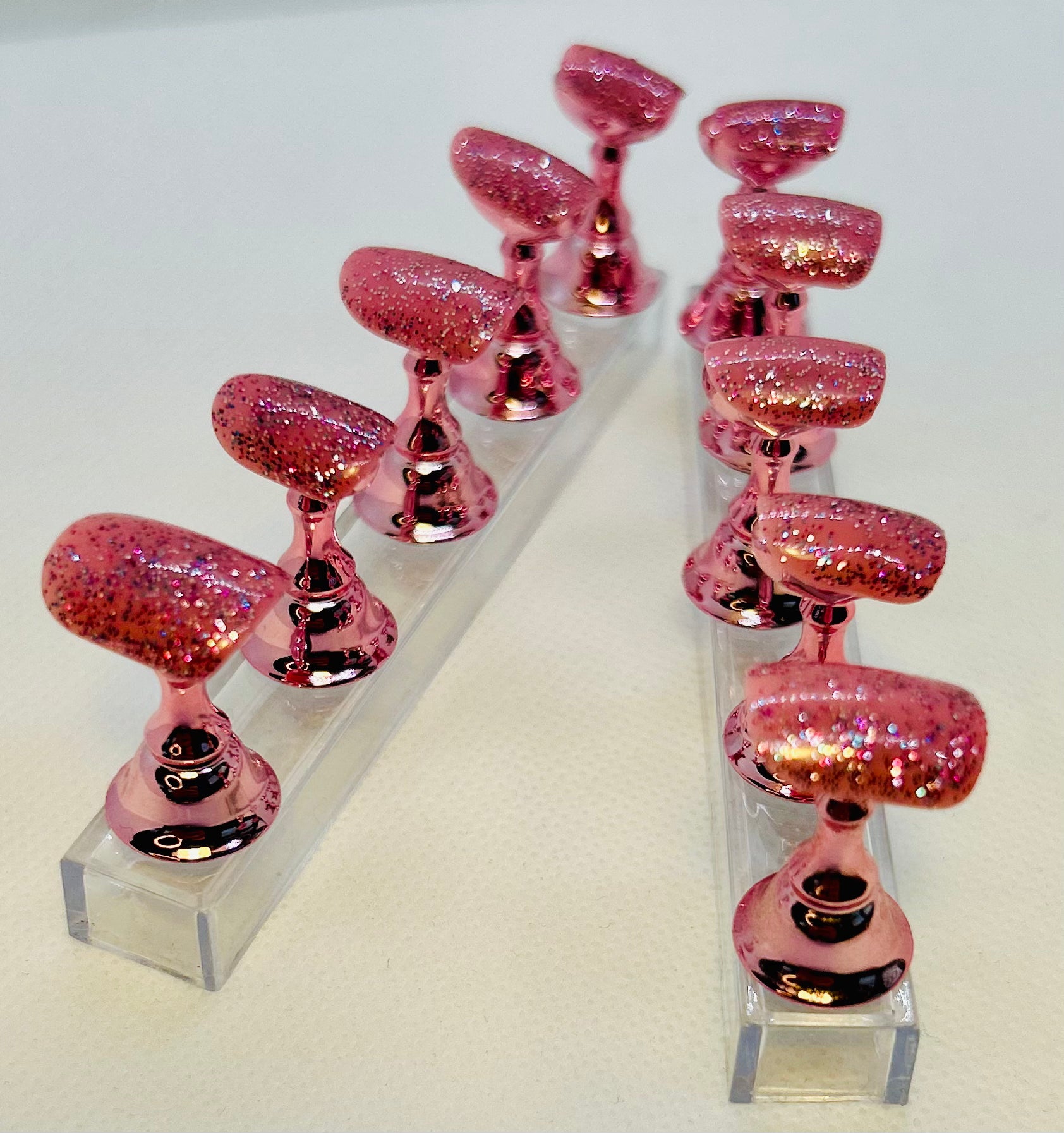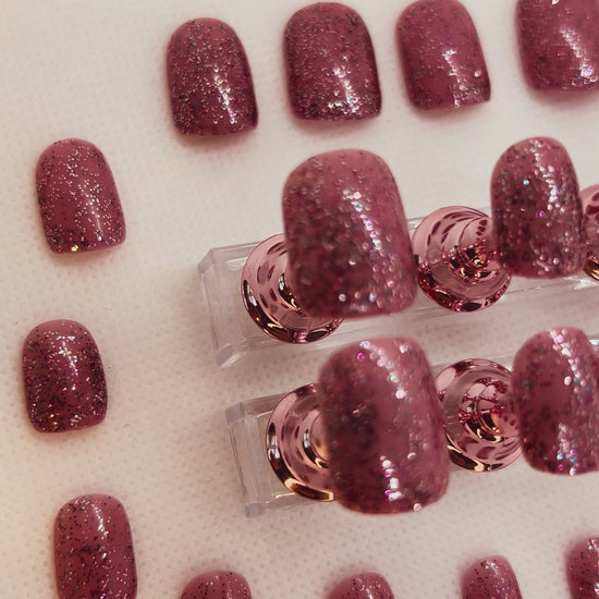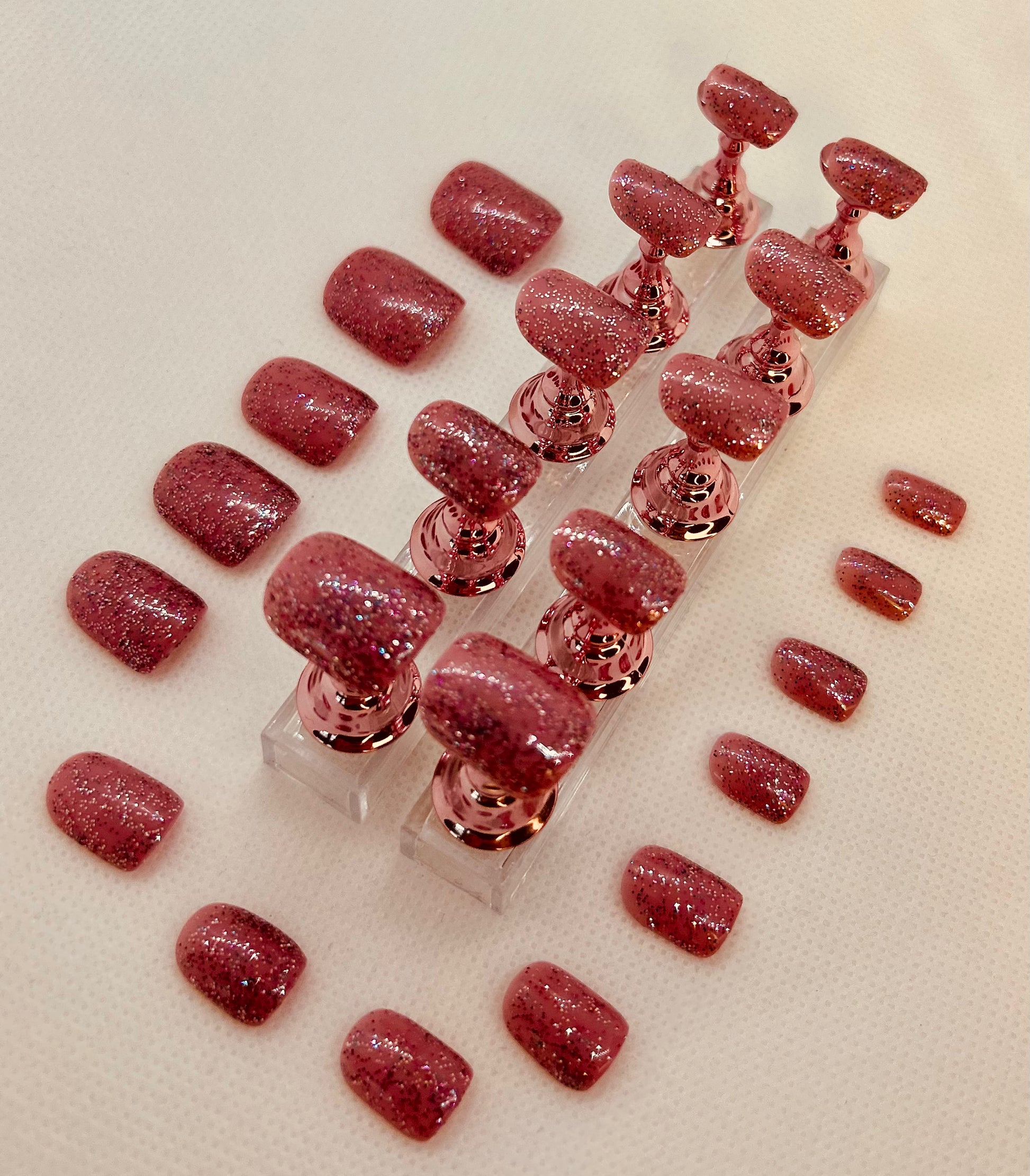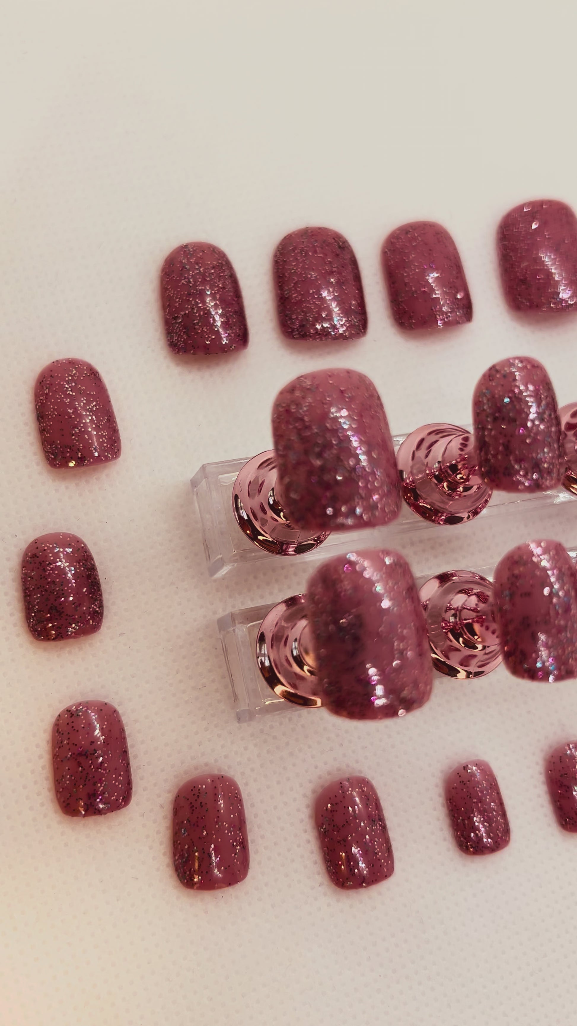 SHORT SQUARE STYLE- A deep pink base packed with fine glitter for a dazzling, high-shine finish. These short square press-ons add instant sparkle to your look, perfect for parties, nights out, or whenever you want your nails to stand out without a salon visit.
